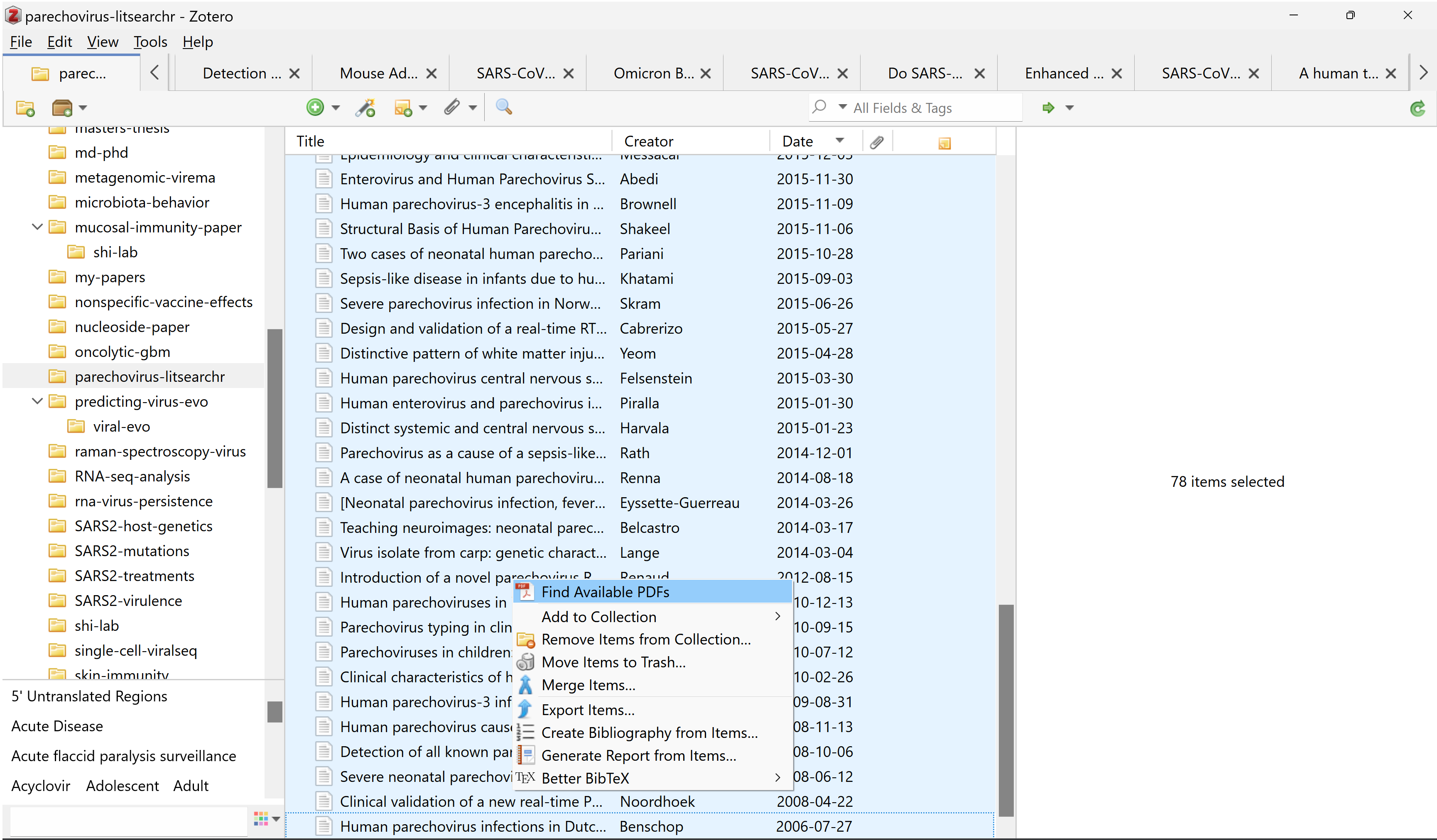 After running the code, the papers should be added to your library and you should be able to inspect the data in the Zotero desktop application. We can use the desktop app to find available full-text PDFs and download them locally.